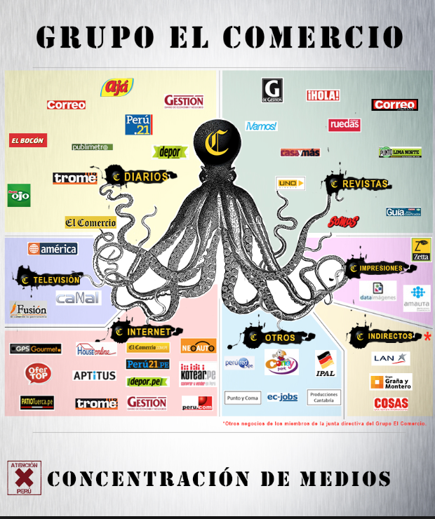 Grupo El Comercio, que ahora controla el 80% del mercado de la prensa escrita en el país, pues tenemos ya un mercado altamente concentrado y oligopolizado en el que cuatro grandes grupos familiares o económicos controlan la mayor parte de la prensa, la radio y la televisión (…)