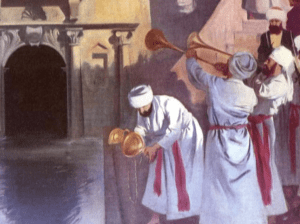 Throughout the year, the daily offerings in the Temple were accompanied by the pouring of wine on the altar. On Sukkot, water was poured in addition to the wine. The drawing of water for this purpose was preceded by all-night celebrations in the Temple courtyard, with music-playing Levites, torch-juggling sages and huge oil-burning lamps that illuminated the entire city. The singing and dancing went on until daybreak, when a procession would make its way to the Shiloach spring which flowed in a valley below the Temple.
