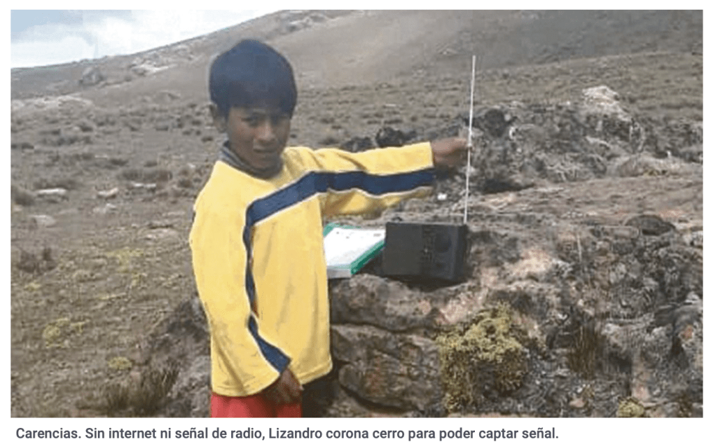 Penuria. A diario, cientos de niños convierten los apus del ande peruano en sus salones de clases. Desde temprano inician la caminata llevando pequeñas radios en el cuello. Se estima que el 35% de escolares en Puno no cuentan con acceso a medios de comunicación. Algunos desistieron de estudiar.