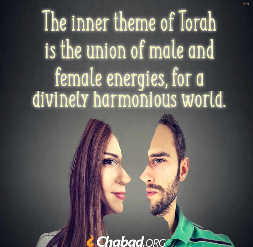 Because this truly is the theme of all of Torah: The union of male and female energies, so that the world can operate in harmony.