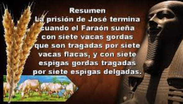 La prisión de Iosef termina cuando el Faraón sueña con siete vacas gordas que son tragadas por siete vacas flacas, y con siete espigas gordas tragadas por siete espigas delgadas. Iosef interpreta los sueños diciendo que significan que siete años de abundancia serán seguidos de siete años de hambruna, y aconseja al Faraón almacenar grano durante los siete años de abundancia. El Faraón nombra a Iosef como gobernador sobre Egipto. Iosef se casa con Asnat, hija de Potifar, y tienen dos hijos, Menashé y Efraím(…)