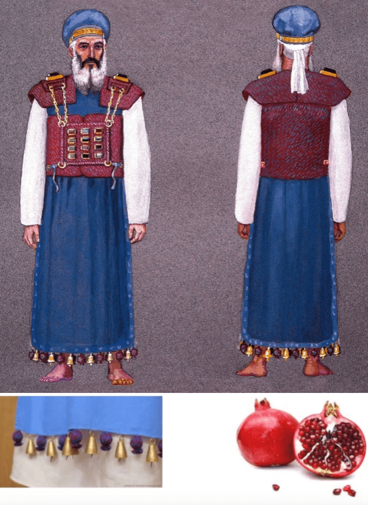 33 And on its bottom hem you shall make pomegranates of blue, purple, and crimson wool, on its bottom hem all around, and golden bells in their midst all around.   לגוְעָשִׂ֣יתָ עַל־שׁוּלָ֗יו רִמֹּנֵי֙ תְּכֵ֤לֶת וְאַרְגָּמָן֙ וְתוֹלַ֣עַת שָׁנִ֔י עַל־שׁוּלָ֖יו סָבִ֑יב וּפַֽעֲמֹנֵ֥י זָהָ֛ב בְּתוֹכָ֖ם סָבִֽיב: