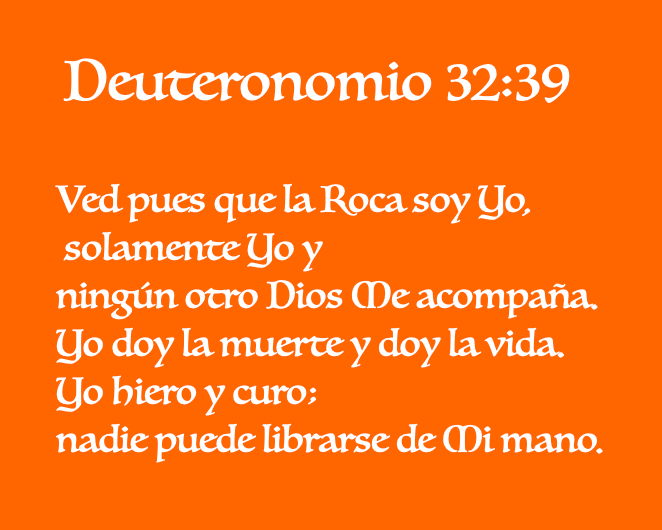 (39) Ved pues que la Roca soy Yo, solamente Yo y ningún otro Dios Me acompaña. Yo doy la muerte y doy la vida. Yo hiero y curo; nadie puede librarse de Mi mano.