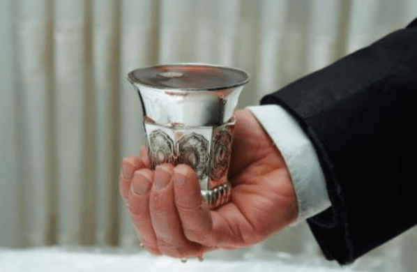 6.- Kidush: Todos se ponen de pie mientras el conductor sostiene una copa llena de vino o jugo de uva, para santificar el Shabat, recordando que “en seis días, Dios creó el cielo y la tierra – y en Shabat Él descansó”.