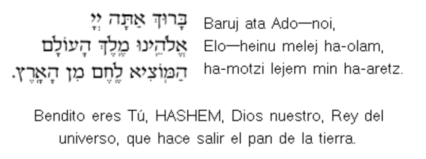 8.- Ha-Motzi: Dos jalot son puestas en una tabla o un plato, cubiertas con un paño decorativo en la mesa. Los dos panes conmemoran la doble porción de maná que caía del cielo cada viernes mientras los judíos estaban en el desierto. Después de la bendición, el conductor corta jalá para todos y la sirve. Le ponemos sal al pan porque es un preservante, simbolizando que esta comida no es simplemente una experiencia transitoria, sino que un momento que durará por la eternidad.