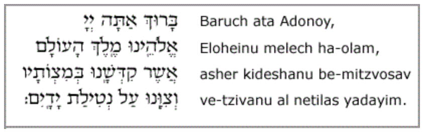 7.- Lavado de Manos: Lavamos nuestras manos para purificarnos antes de comer pan. Primero, sácate todos los anillos para que el agua pueda cubrir tus manos completamente, y después di la bendición.
