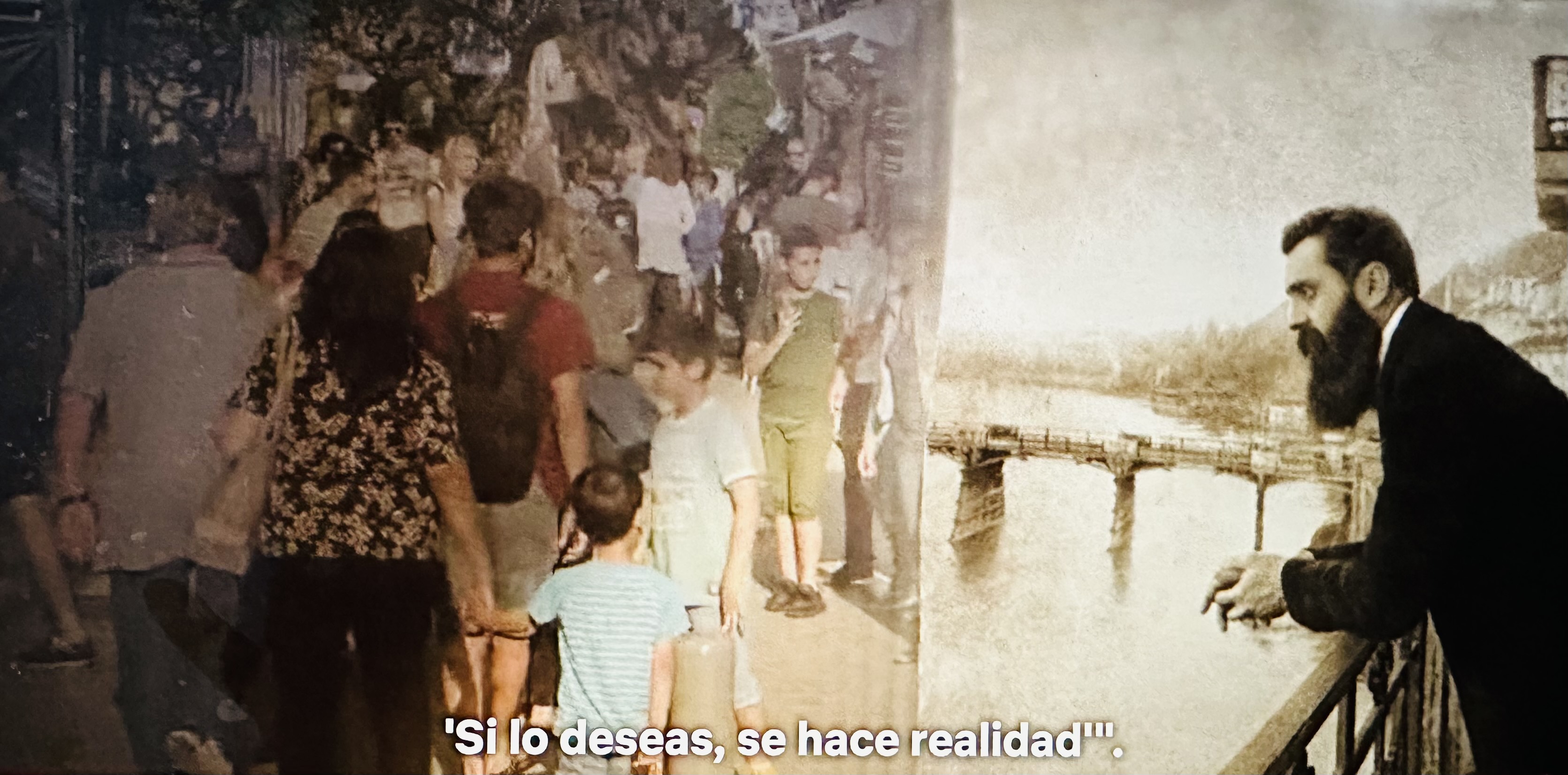 En esta imaginación Simon Peres, lleva a Herzl de un extremo a otro del país, mostrandole al padre fundador lo que sus sueños habían creado.