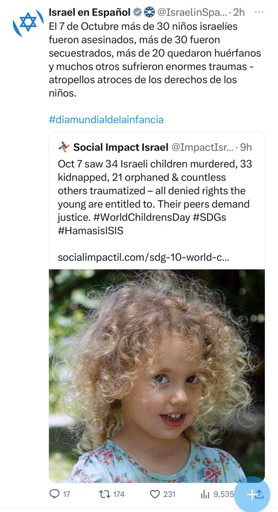 Hasta ahora, no he visto ningún pronunciamiento de la ONU, UNICEF, ONUMujer, respecto a la masacre del 7 de octubre, condenando dicho acto. Así como tampoco he visto ningún pronunciamiento o invocación para que liberen a los 240 secuestrados, entre ellos; hombres, mujeres, niños, niñas, bebés, una mujere embarazada, todos de diferentes nacionalidades.