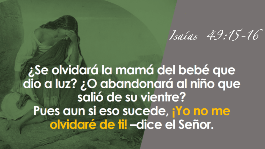 | 15 Shall a woman forget her sucking child, from having mercy on the child of her womb? These too shall forget, but I will not forget you. | טוהֲתִשְׁכַּ֚ח אִשָּׁה֙ עוּלָ֔הּ מֵֽרַחֵ֖ם בֶּן־בִּטְנָ֑הּ גַּם־אֵ֣לֶּה תִשְׁכַּ֔חְנָה וְאָֽנֹכִ֖י לֹ֥א אֶשְׁכָּחֵֽךְ: | |